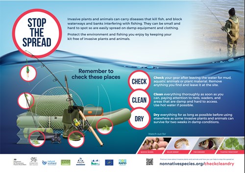 Biosecurity is the prevention of the introduction and spread of harmful pests, diseases and invasive non-native species. These organisms can spread naturally through the wind, water and animal migration. Human activity, however, such as moving contaminated fishing equipment or boats, or wearing contaminated boots, can have a big impact on their spread. In the water environment, there are a number of invasive species that are known to be very damaging to the water environment and its ecosystems. Animals include the “killer” shrimp and Signal crayfish, and plants include floating pennywort and water primrose. We are also aware of the parasite that was present among our carp, as a result of injudicious and unregulated stocking of fish in the past.